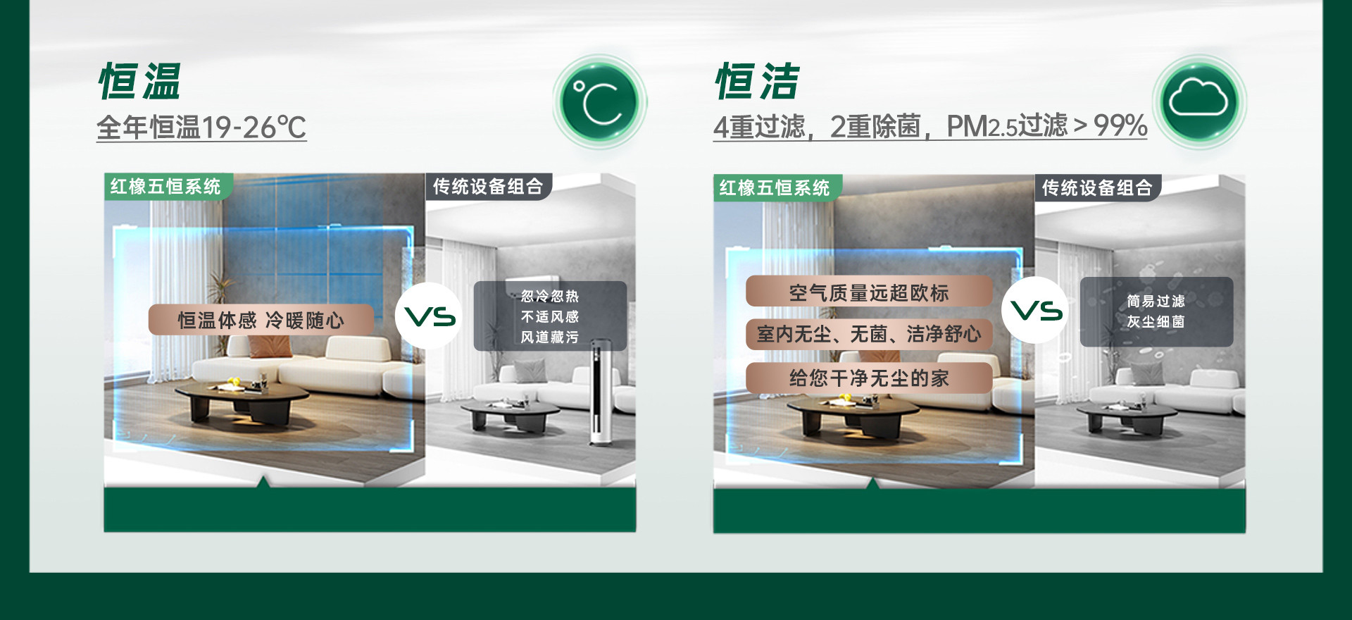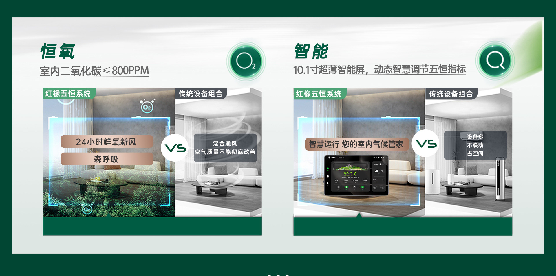 精英版紅橡五恒系統是一套對室內空氣的溫度、濕度、潔凈度、清新度(含氧量)和寧靜度(環境噪聲)進行聯合調節的高科技系統,系統通過對與人體健康息息相關的“五度”的調節,使室內環境始終處于溫度恒定(恒溫)、濕度恒定(恒濕)、含氧量恒定(恒氧)、潔凈度恒定(恒潔)、寧靜度恒定(恒靜)的狀態,室內恒溫恒濕、空氣清新、室內潔凈、無聲無風、健康舒適、節能環保。